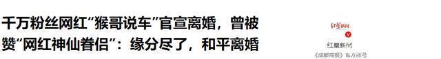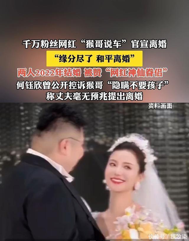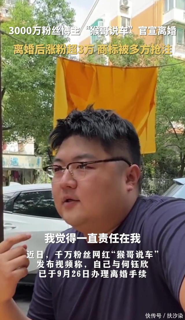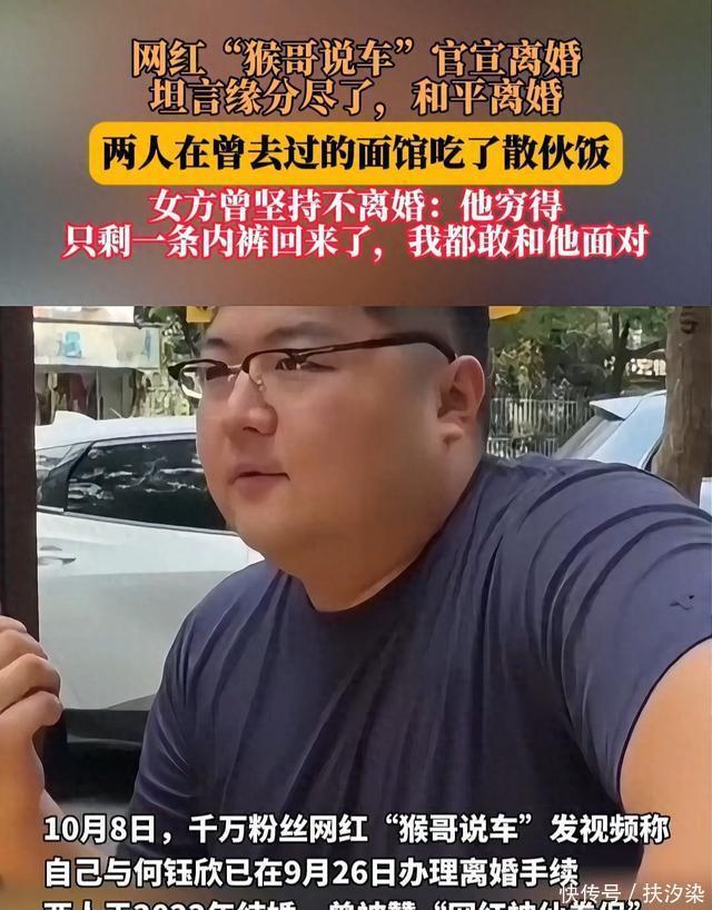 3500万粉网红猴哥离婚,五年感情藏着多少未说的话? 10月8日,坐拥3500万粉丝的汽车顶流博主“猴哥说车”与妻子何钰欣,几乎同时在社交平台发布短视频,这段曾被全网称作“神仙眷侣”的婚姻,终究还是画上了句号。 极目新闻在报道中明确提到,两人同步官宣“缘分尽了,和平离婚”,并证实9月26日已正式办理离婚手续。
